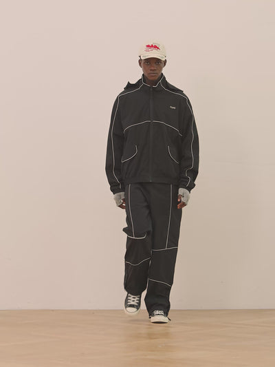 The Black Tracksuit Pants channel classic sportswear through a modern lens, designed in a sleek black body with contrast cream piping throughout. An elasticized waistband with adjustable drawcords ensures comfort, while dual waist pockets with tonal black zip closures and dual back pockets with button closures add everyday utility. Hidden zippers at the hems with tonal nylon cords and antique silver toggles allow for customizable styling. Finished with a cream embroidered FOUND logo at the front, these pants balance technical features with signature FOUND detailing.