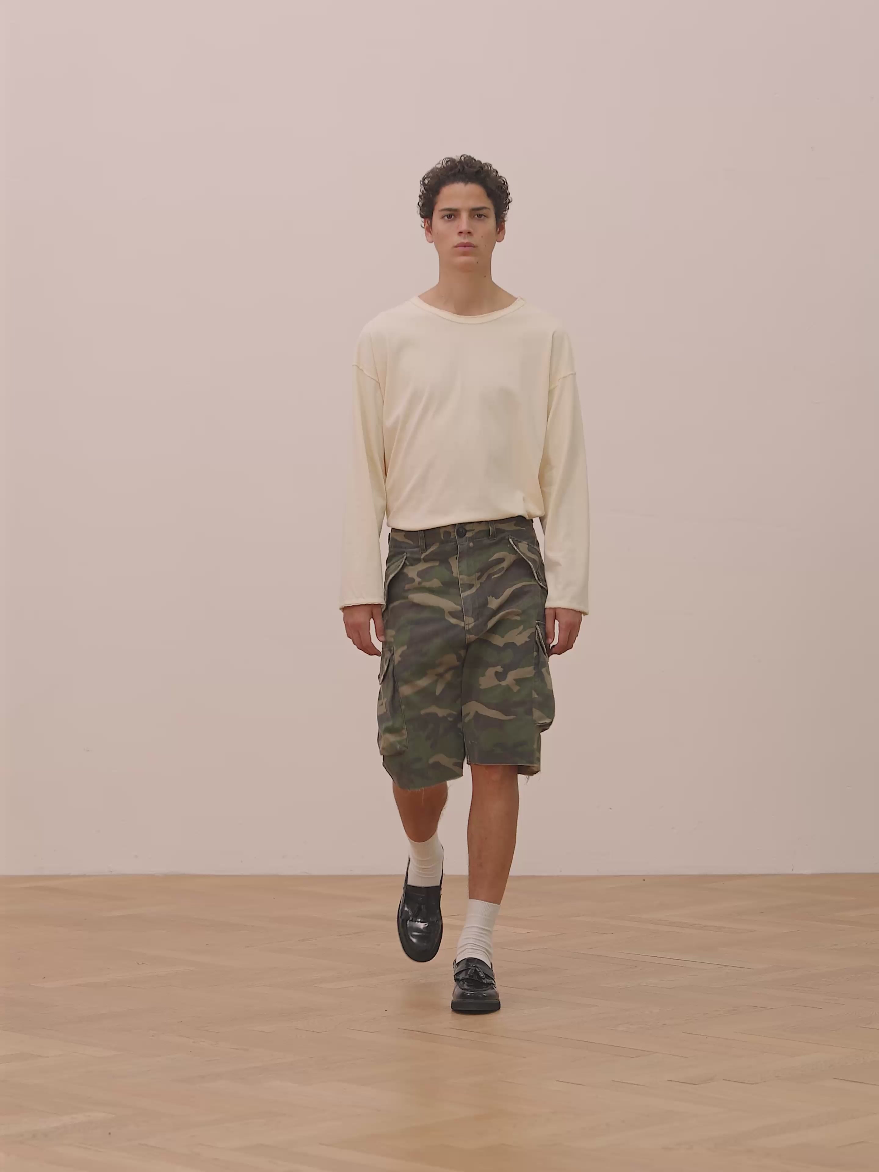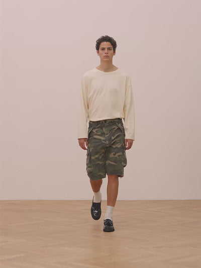 Our Camouflage Twill Utility Cargo Shorts are a modern essential, combining durability and comfort. Made from midweight cotton twill with a 9.5-inch inseam, these shorts feature six roomy pockets with secure button closures, including angled thigh compartments for easy access. Adjustable button tabs at the waistband provide customizable fit options, while tonal stitching and tortoise dark brown buttons complete the minimalist aesthetic. The fading, enzyme wash, distressing, and raw-hem finish provide a worn-in vintage look.
