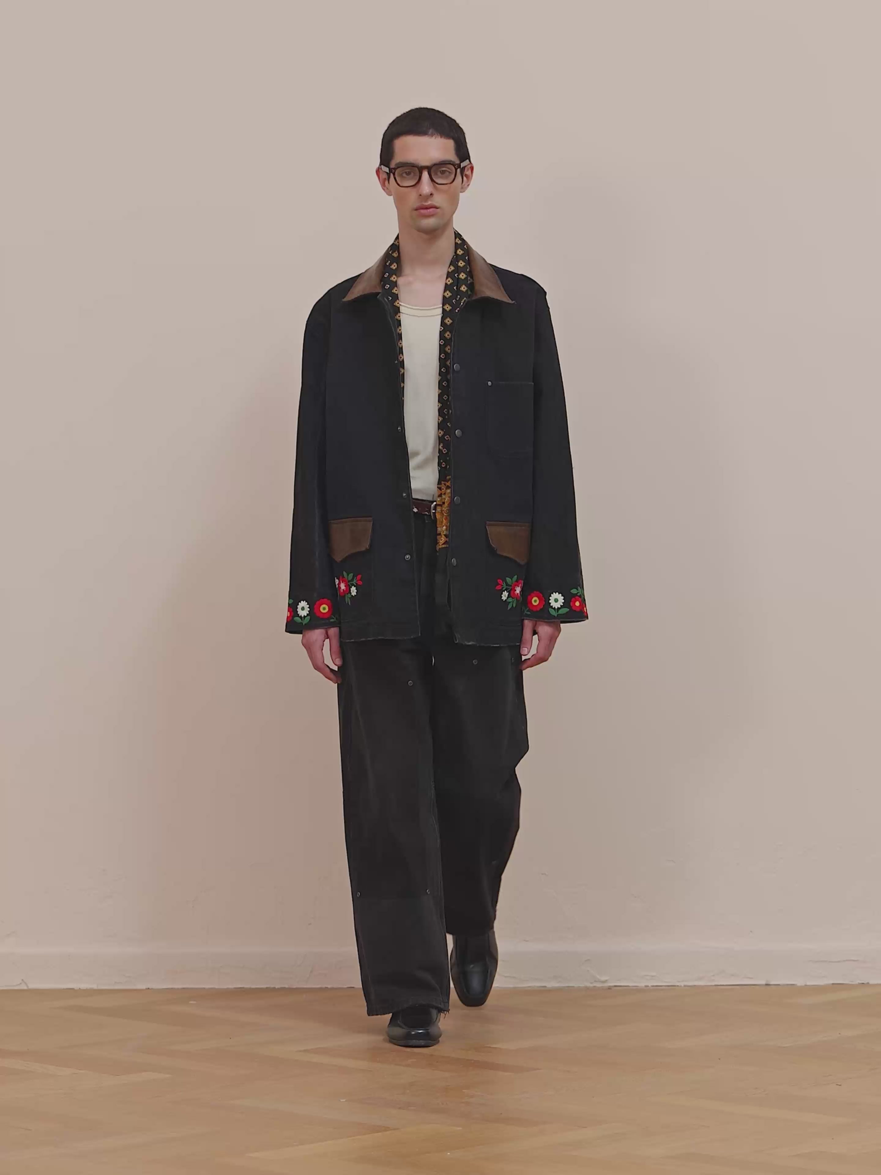 Cut from durable black canvas, this work jacket is elevated with contrast brown leather trim at the collar and pockets and delicate floral embroidery along the hem and cuffs. Snap-button closure and a relaxed fit balance structure with ease, while subtle fading adds depth. A statement piece rooted in craftsmanship and wearability.