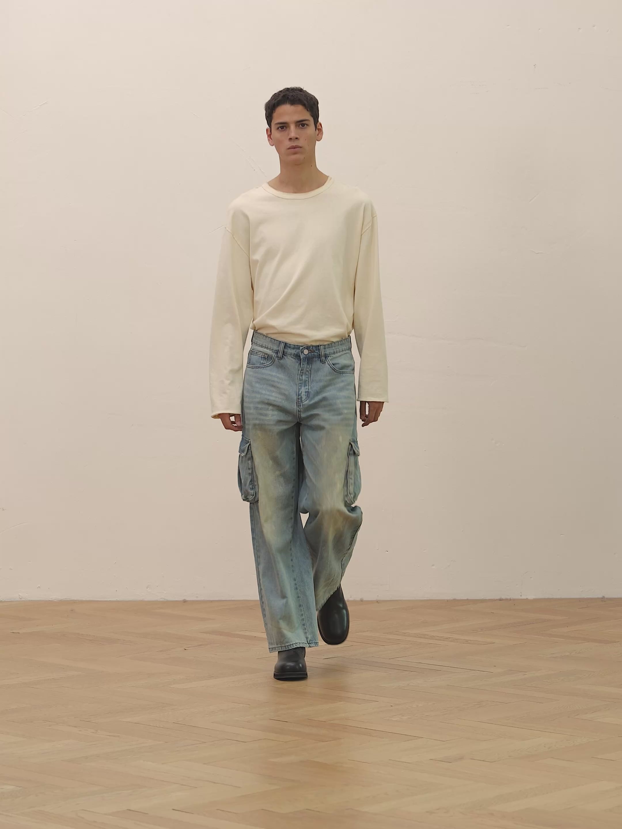 Merging workwear durability with vintage character, the Cargo Jeans are constructed from 100% cotton denim with a relaxed, wide-leg fit. Large side cargo pockets add a utilitarian edge, while subtle distressing and staining details give them a worn-in feel. The sturdy construction and adjustable waist tabs ensure long-lasting wear and a customizable fit.