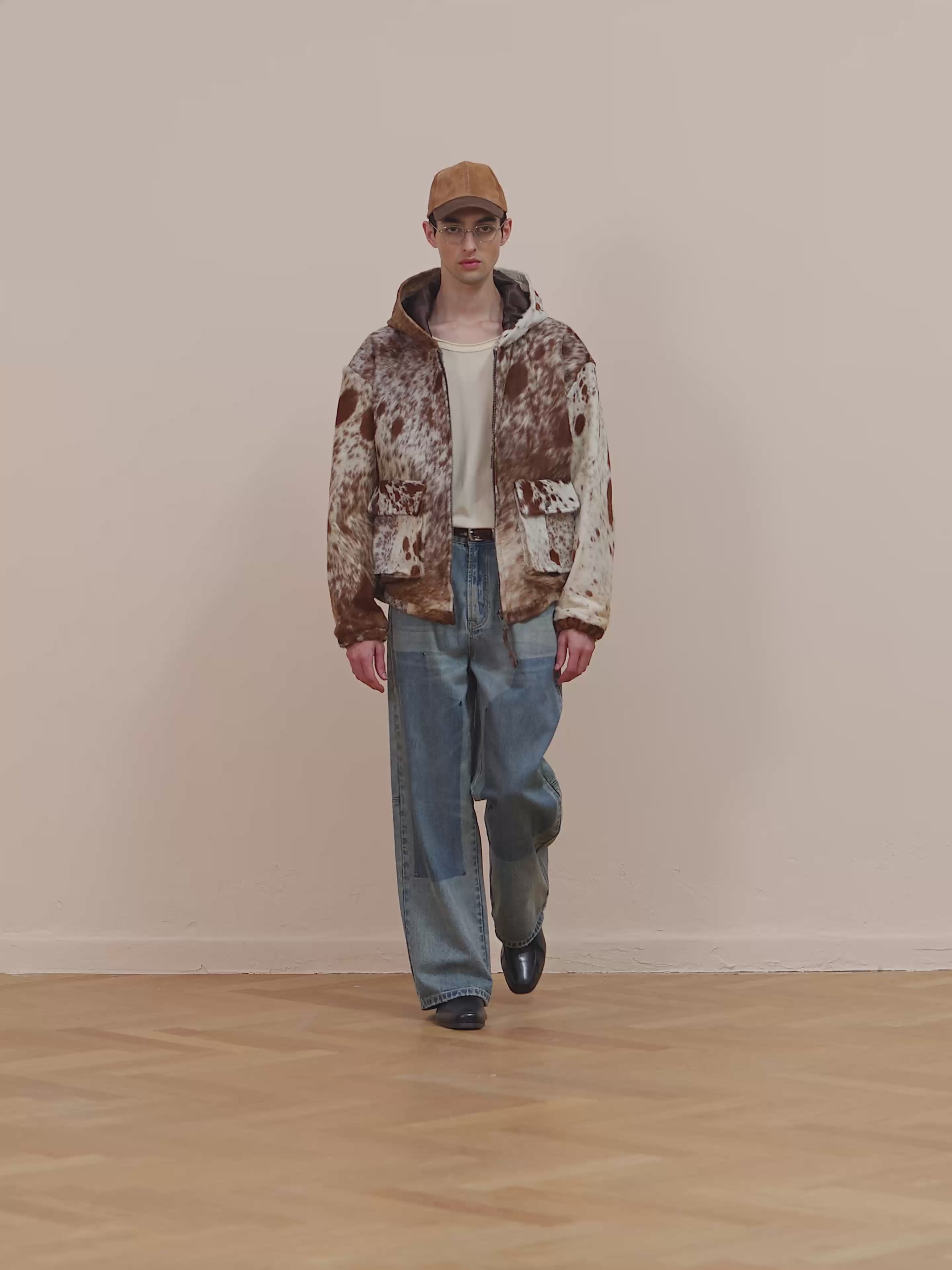 The Cowhide Hoodie is cut from genuine cowhide, celebrating the irregular markings and textures of the material itself. Each jacket is one-of-a-kind, with no two patterns alike, making every piece entirely unique. A roomy hood, oversized flap waist pockets, and zipped front closure bring function to its tactile surface. The relaxed, boxy silhouette makes it versatile, while the raw, organic finish ensures it ages beautifully over time.