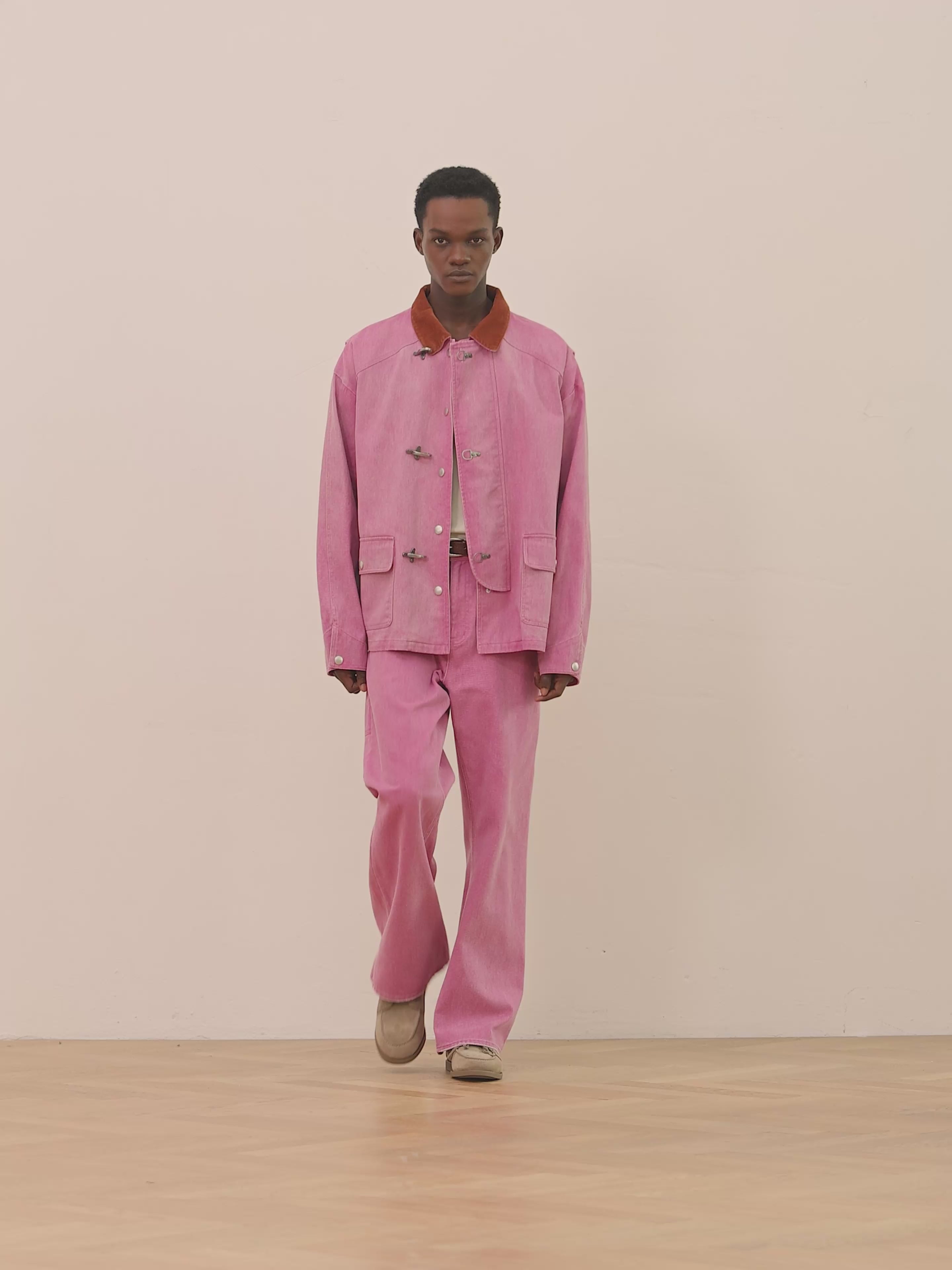 The Faded Fireman Jacket draws inspiration from vintage utility wear, reimagined with a soft, timeworn character. Crafted in sage green with a vintage-aged wash, it features a contrasting brown corduroy collar that adds texture and depth. The front is secured with antique silver fireman clasps and button closures, a nod to traditional workwear, complemented by snap-button flap pockets and snap cuffs.