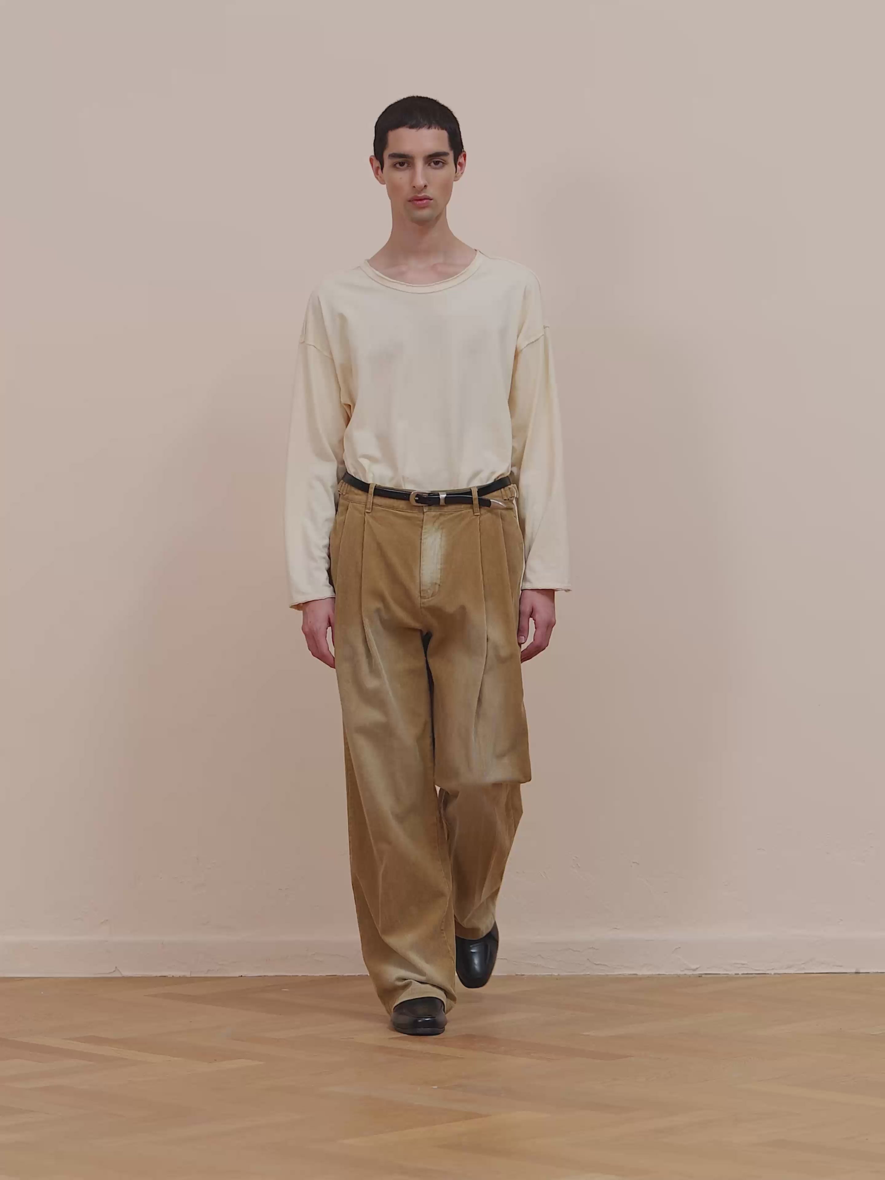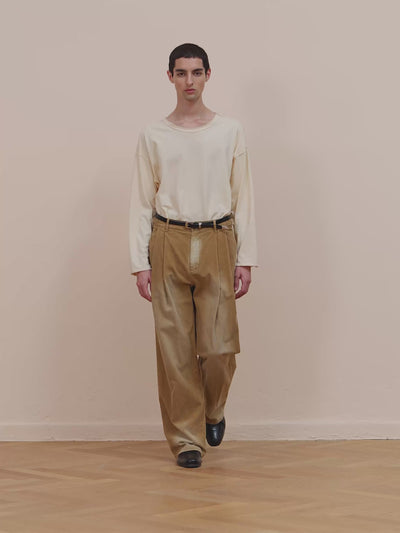 Our spin on a classic silhouette - the double pleated trousers in sand-toned corduroy. Featuring a double pleated front, mid-rise, side slip pockets, and adjustable waist tabs. It's designed to have a wide leg, relaxed fit.