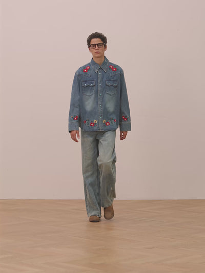 Crafted from structured denim with a light distressed wash, this shirt blends timeless western appeal with intricate floral embroidery. Vibrant yellow contrast stitching traces the seams, while turquoise button closures anchor the design. The relaxed silhouette and dual snap chest closure reference a classic western shirt.