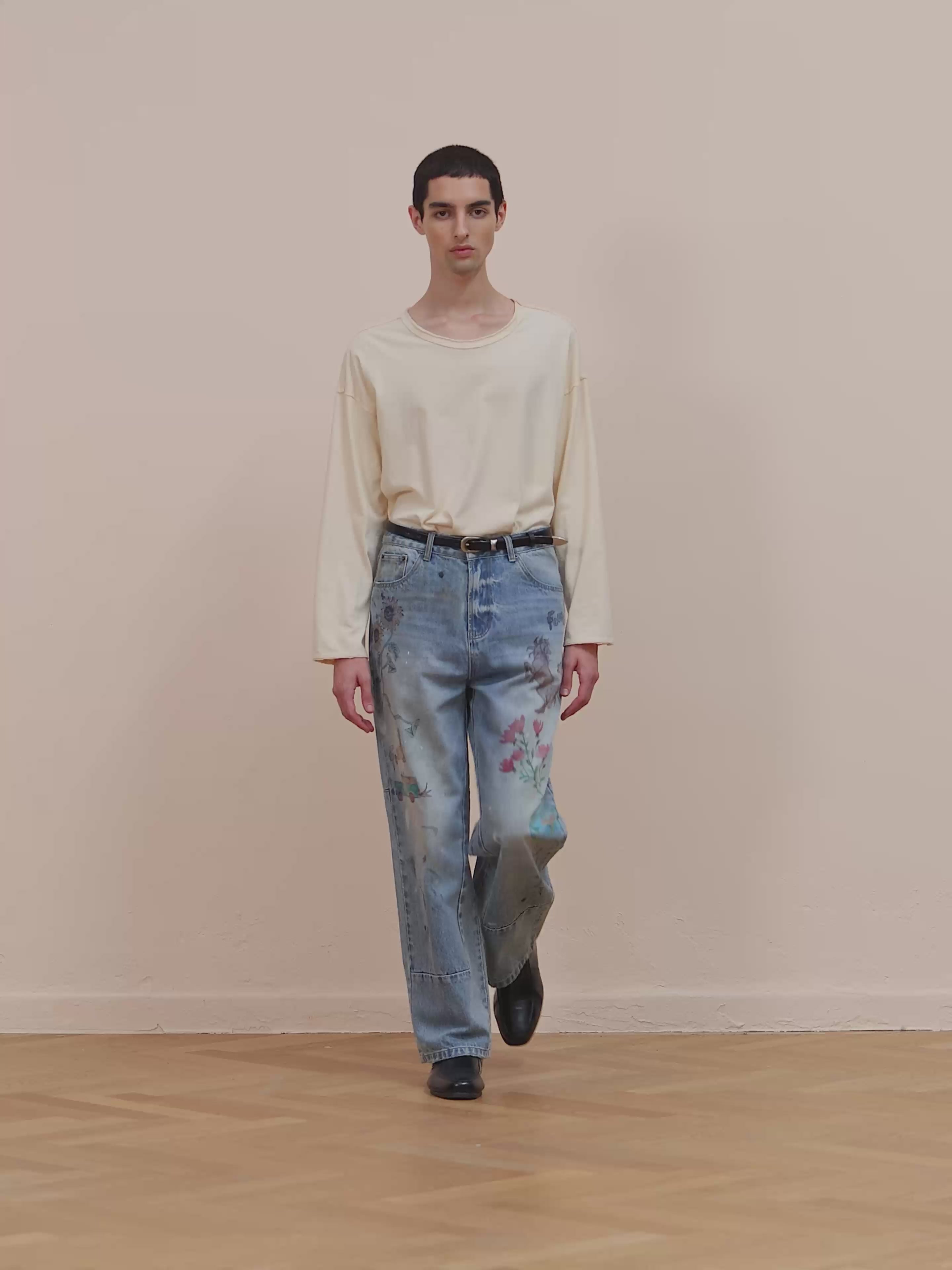 Crafted from durable mid-weight cotton, our hand-drawn style Printed Denim Jeans showcase original artwork — wildflowers, galloping horses, sunflowers, and FOUND’s signature emblems — making each pair completely unique. A light wash, subtle distressing and paint marks give them a naturally worn-in look, while reinforced paneling ensures longevity. Designed to capture both artistry and utility, they only get better with every wear.