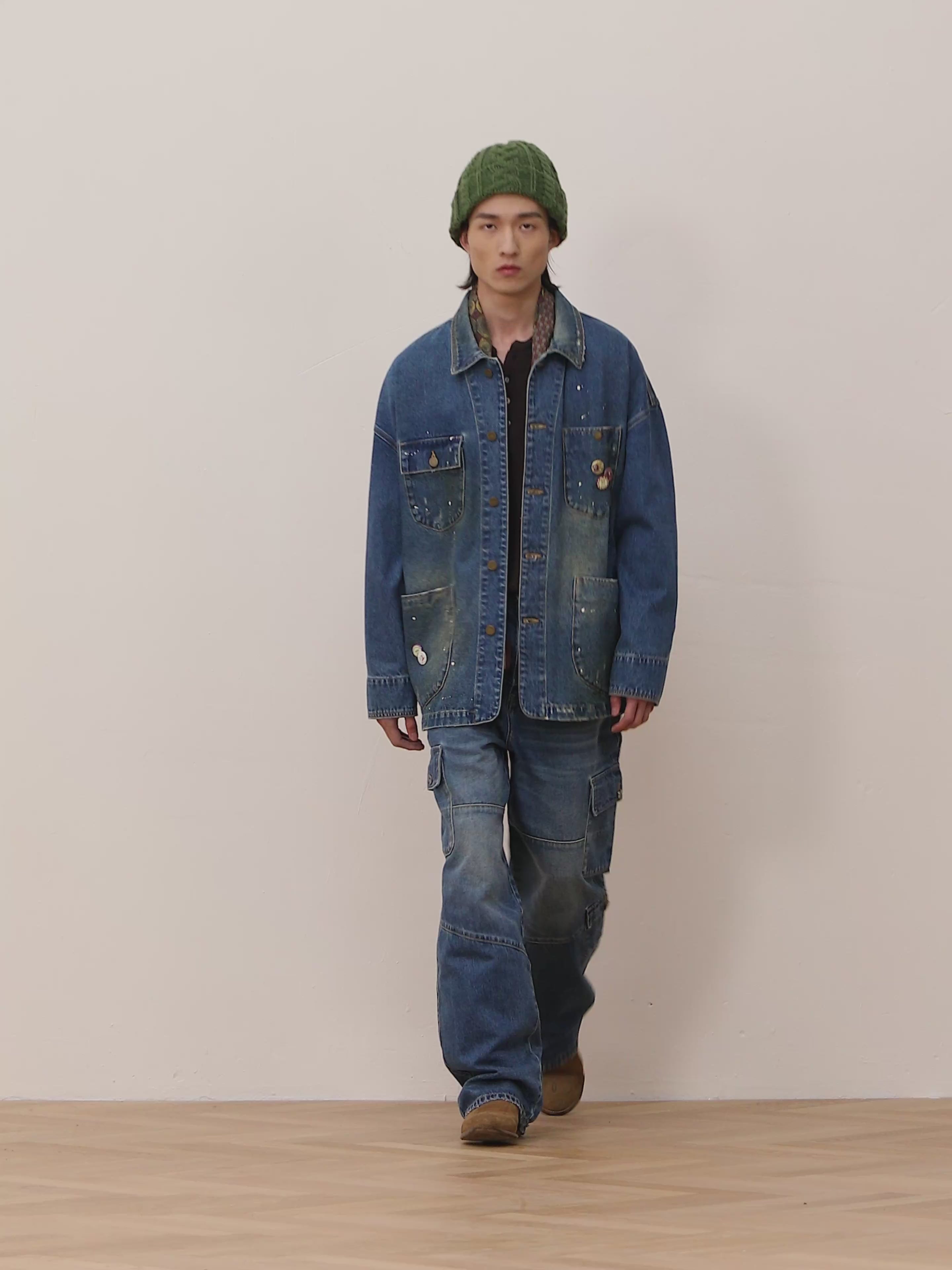 Our Kavir Denim Painters Jacket is inspired by vintage artist uniforms. The garment features large pockets to store brushes and tools and is made from a durable denim to ensure longevity. Features removable pins, light distressing, a vintage wash, and paint splatter detail to create a truly lived in feel and look.