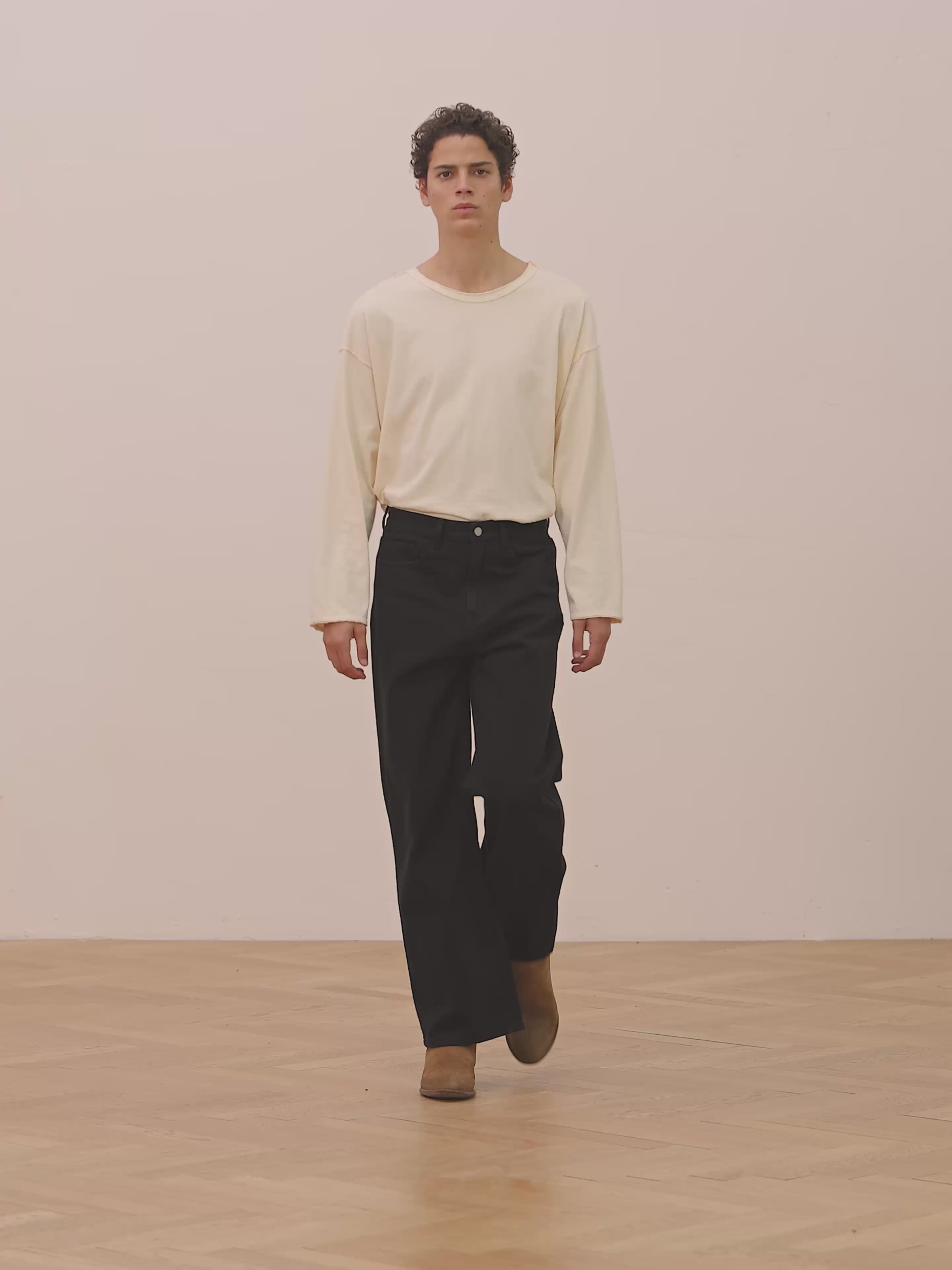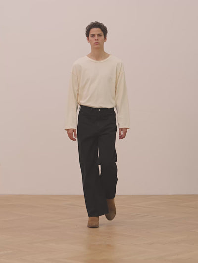 Our take on the classic wide leg jean in a jet black wash. The garment features light distressing and is cut from a classic five-pocket silhouette, shaped with a mid rise and a wide-leg cut.