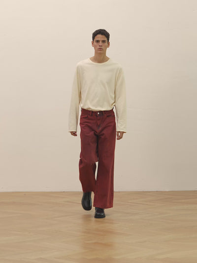 Our take on the classic wide-leg jean, but in a vintage red wash. The garment is cut from 100% cotton and features light distressing, a classic five-pocket silhouette, shaped with a mid rise and a wide-leg cut.
