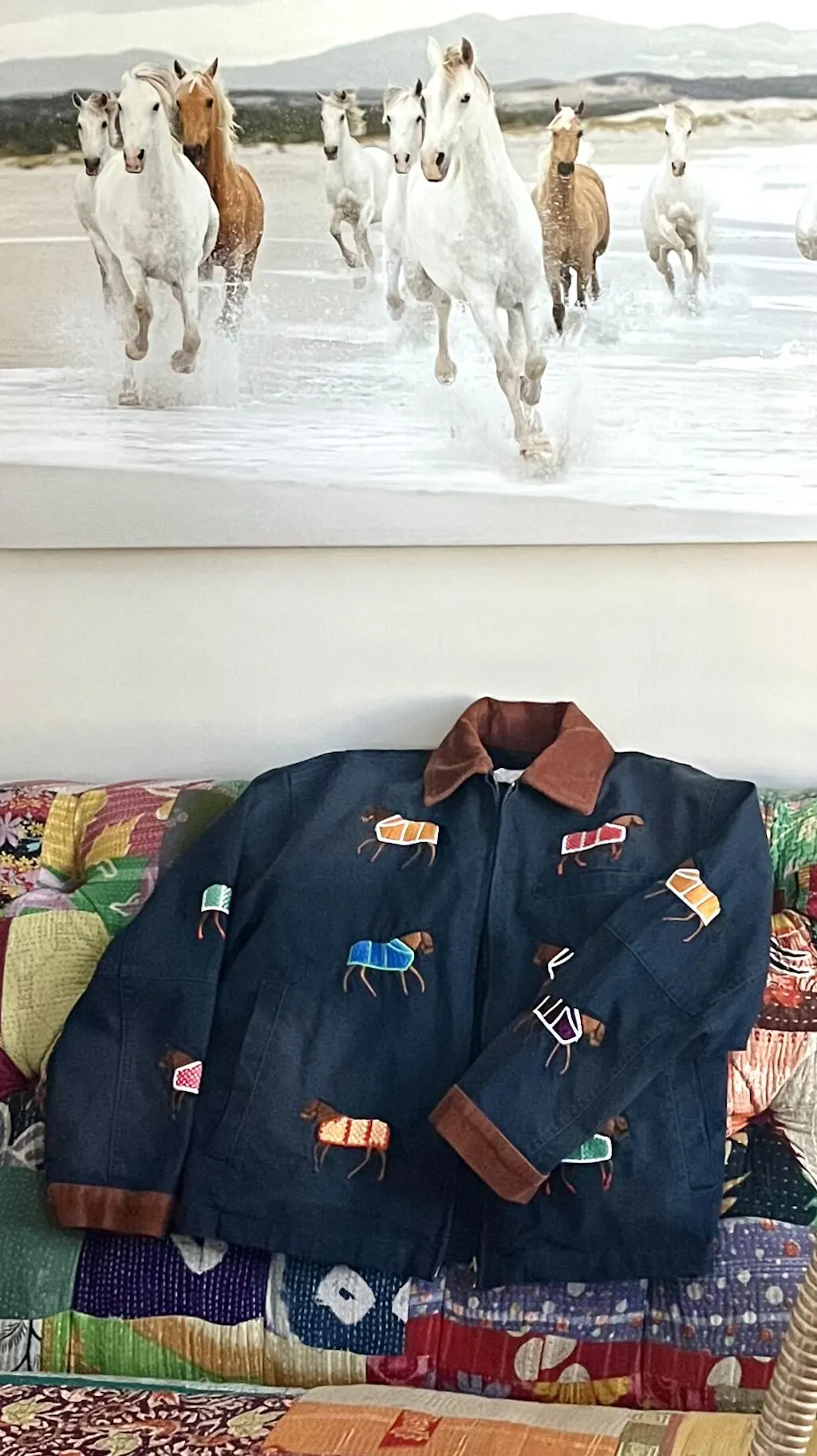 A playful tribute to equestrian culture, this navy jacket is embroidered with a procession of horses dressed in patterned blankets of bold color. Set against the grounded frame of corduroy trims at the collar and cuffs, it balances whimsy with function. A jacket that turns everyday wear into a field of stories in motion.