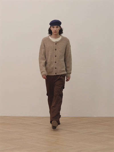 Our Mohair Cardigan in tan. Crafted from a carefully selected faux mohair fabric for a comfortable, soft to the touch feel. The garment features a slightly oversized fit, tortoise buttons, and double front pockets.