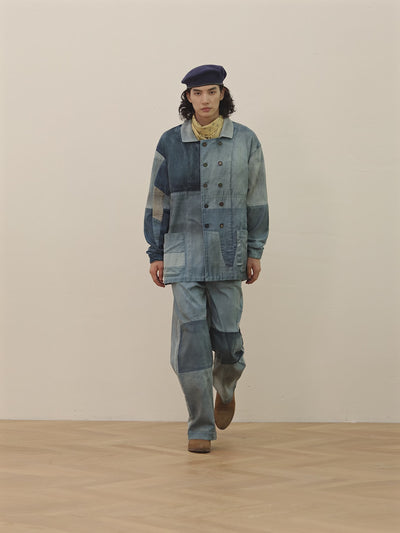 Our Multi Patch Painters Work Jacket draws on inspiration from antique French painters' jackets. Crafted with meticulous attention to detail, the garment features several hand-washed panels conjoined with thick contrast stitching, mismatched color buttons, pleated sleeve cuffs, and hand distressing throughout the jacket. Double-breasted opening with a slouchy, slightly elongated fit.