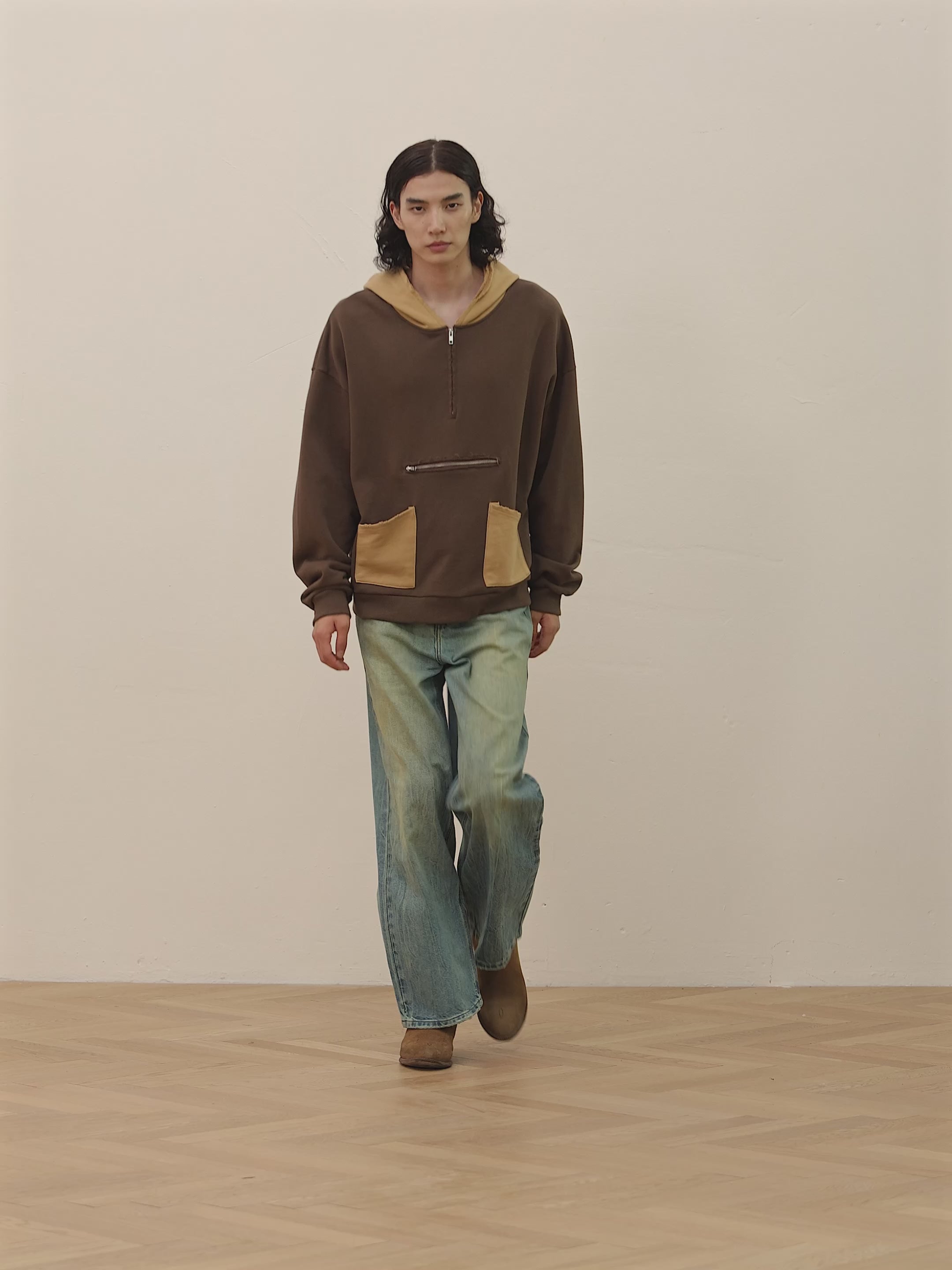 Our Quarter Zip Two Tone Hoodie in brown. A staple oversized hoodie in 100% french terry cotton fabric. The garment features contrast dual front pockets and a quarter zip front opening. The fabric features an enzyme wash and light distressing for an aged, vintage feel.