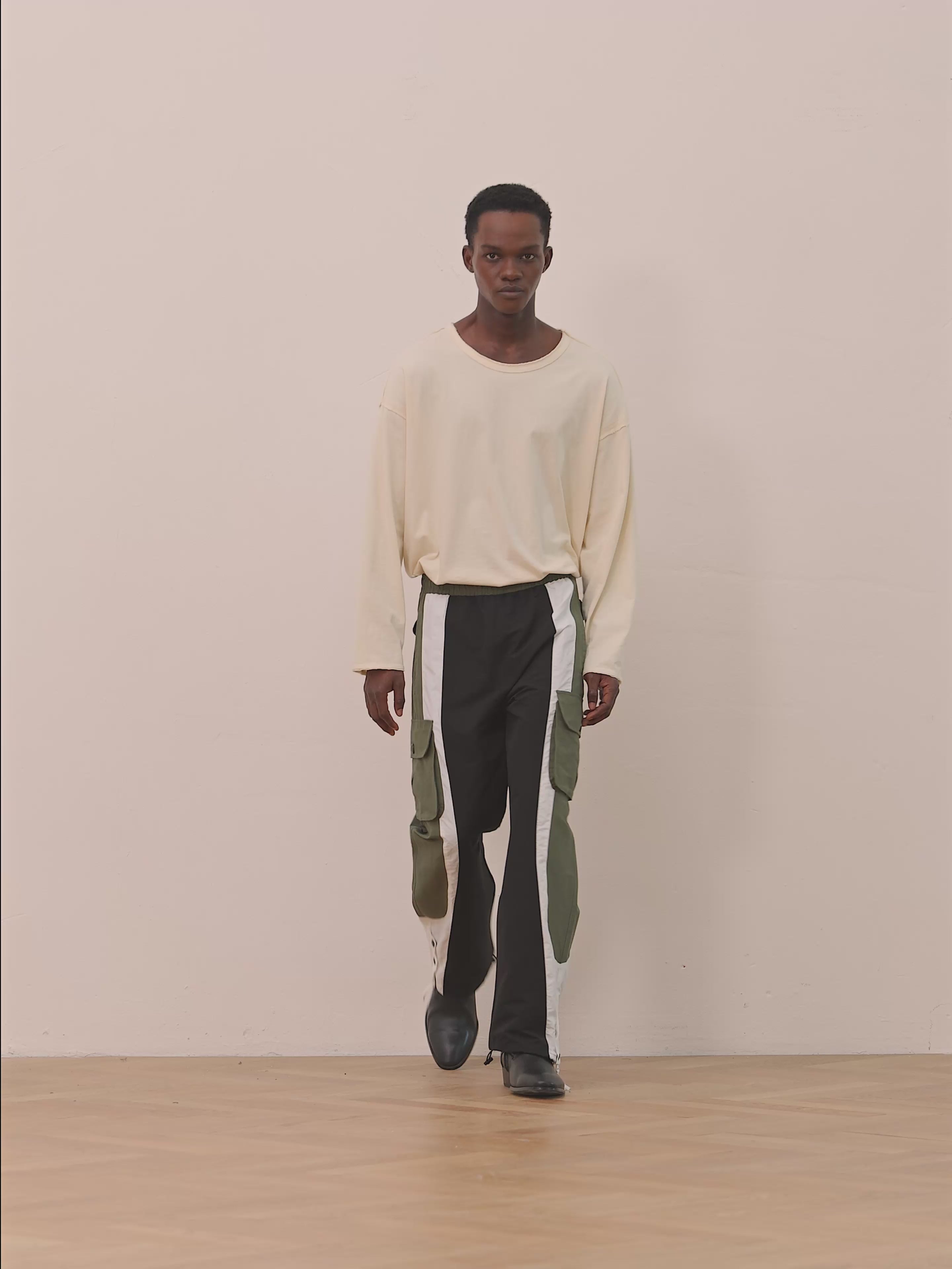 The Sporting Club Track Pants merge utility with a vintage athletic aesthetic, designed in a dynamic black, green, and cream tri-color palette. Crafted from lightweight nylon, they feature contrasting side panels along both legs, dual waist pockets, dual flap pockets at the back, and functional cargo pockets at each leg with tonal button closures. An elasticized waistband with adjustable draw cords ensures comfort, while hidden zippers at the leg openings, a three-button closure at the hem, and tonal nylon cords with antique silver toggles allow for customizable styling. Finished with thoughtful detailing, these pants bring together heritage inspiration and everyday versatility.