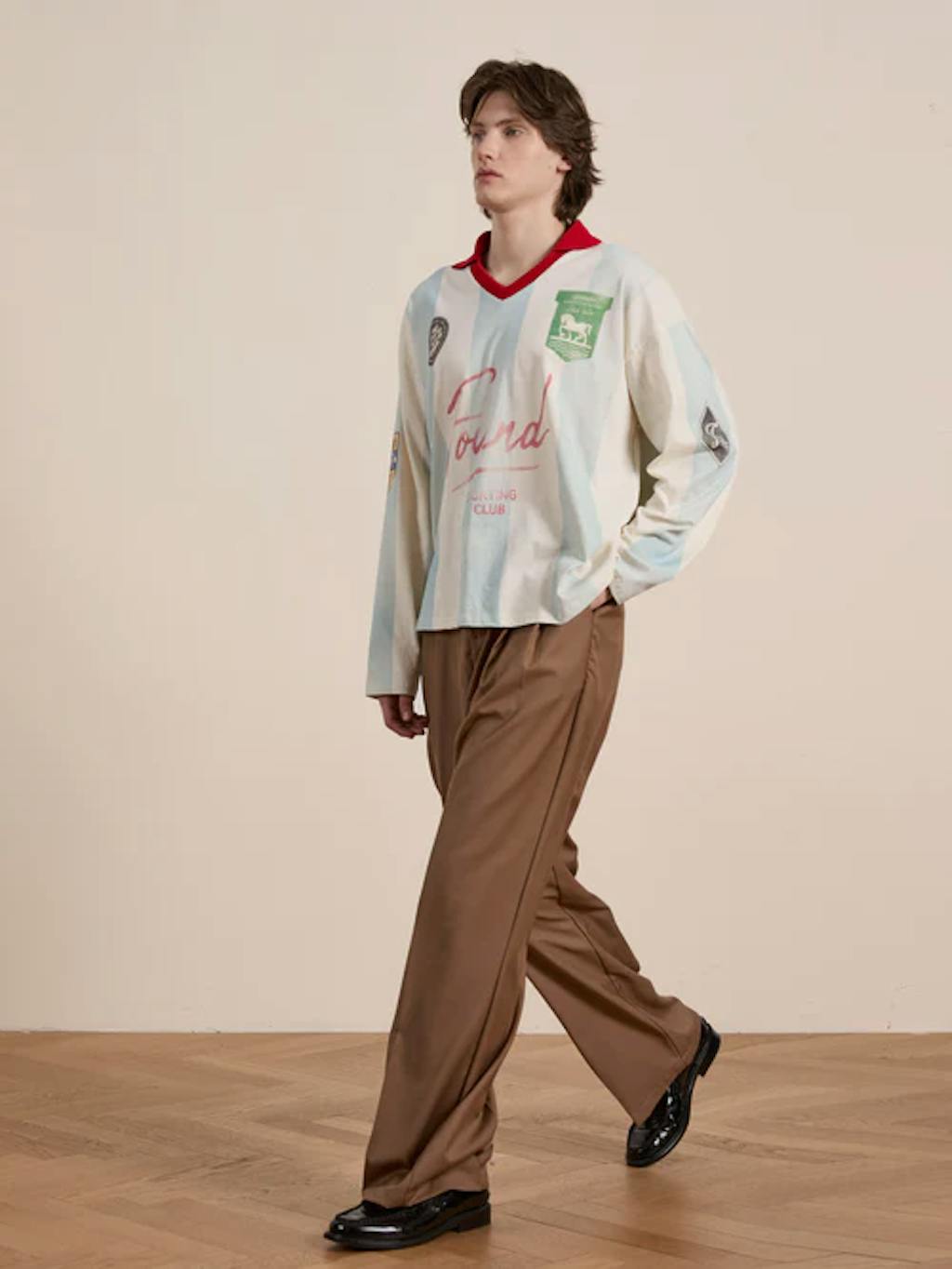 Inspired by international sporting traditions, the Striped Sport LS Jersey revisits the classic football silhouette with a contemporary edge. Vertical stripes in faded light blue and off-white give it a lived-in feel, while soft cotton construction ensures comfort. Accented with faded printed patches, contrasting red collar ribbing, and a weathered “FOUND Sporting Club” logo, the piece blends nostalgia with modern wearability in a relaxed fit.