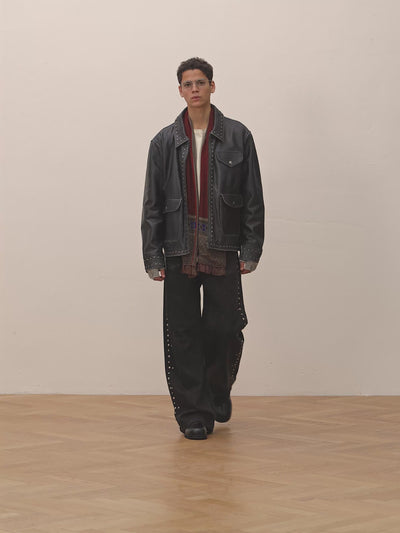 Crafted from genuine Mid-Weight vintage black leather, the Studded Leather Pocket Jacket is a bold reinterpretation of a classic silhouette. Featuring metal stud detailing along the seams and cuffs and an antique matte silver zipper, this jacket balances ruggedness with refinement. Dual front flap pockets offer functionality, while a slightly cropped fit and subtle distressing give it a timeless, lived-in appeal.