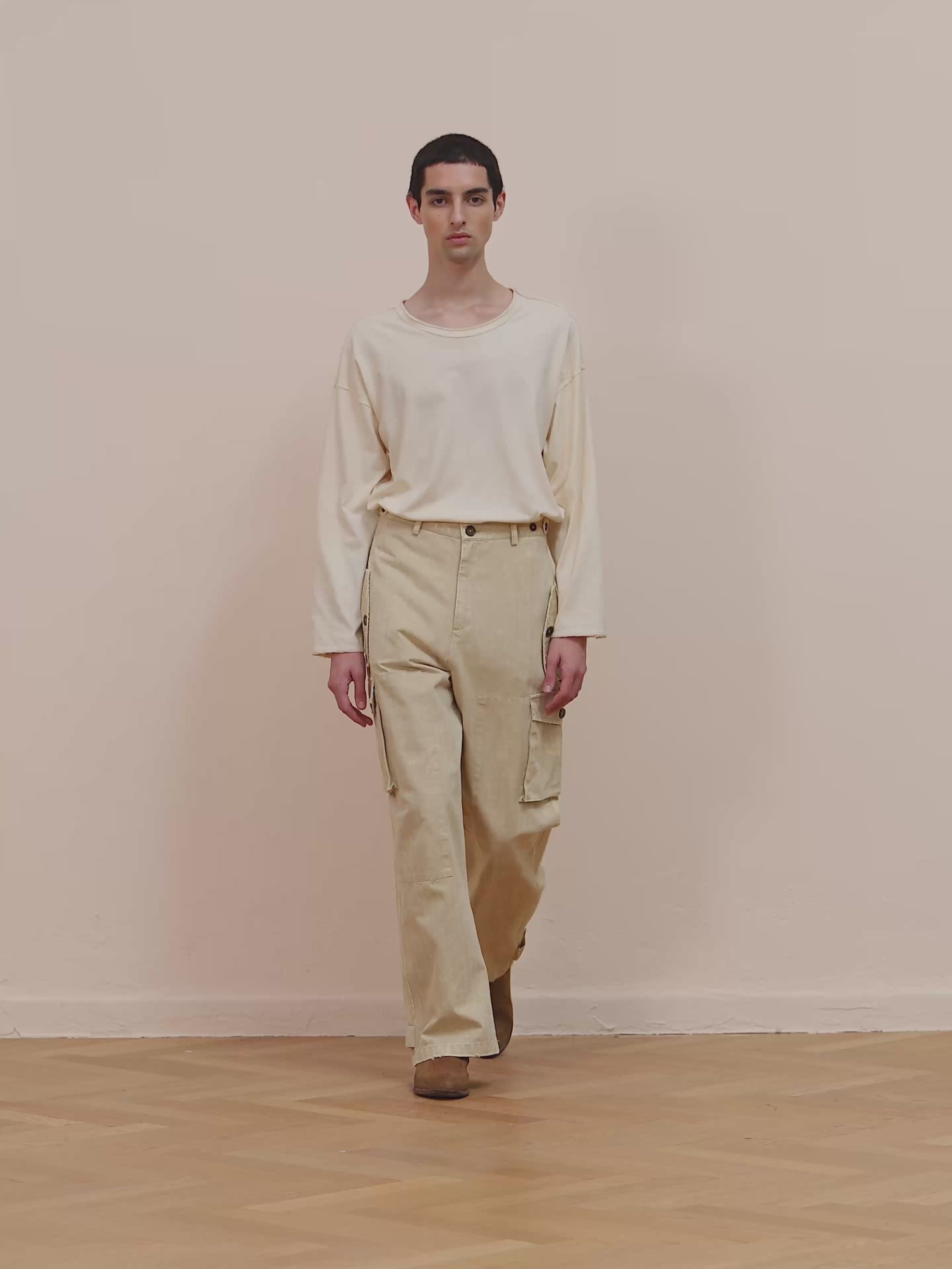 A sophisticated take on utility wear, the Herringbone Cargo pants elevates the timeless herringbone pattern with functional cargo detailing. Crafted from a structured cotton-blend fabric, these wide-leg trousers feature a deep pleats for added volume, multiple cargo pockets for practicality, and adjustable side tabs for a customizable fit. The fusion of formal herringbone and utilitarian design creates a distinctive hybrid piece that effortlessly bridges style and functionality.