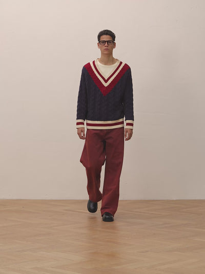 A modern take on a classic, the V-Neck Cricket Sweater is knitted from a soft cotton for warmth and breathability. Its deep V-neckline is framed with bold contrast striping, lending a nostalgic sportswear feel. The relaxed silhouette and intricate cable knit texture create a balance of structure and ease, perfect for layering.